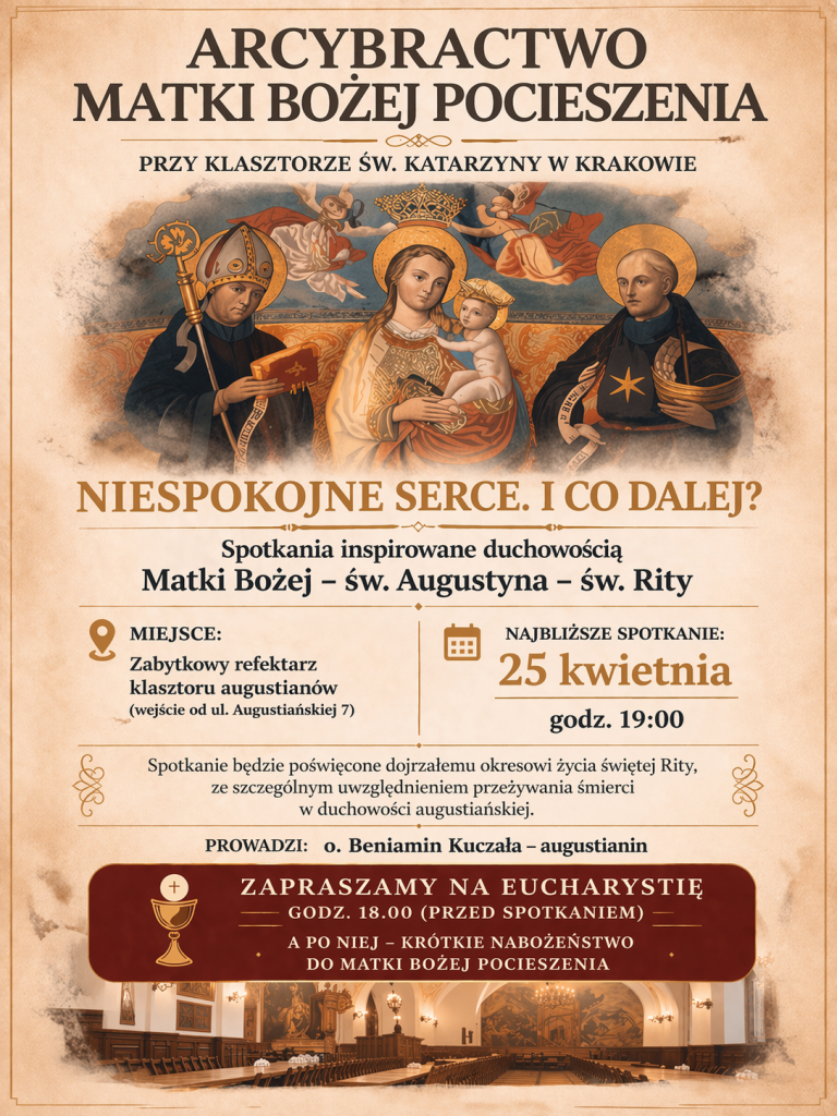 Arcybractwo Matki Bożej Pocieszenia oraz bracia augustianie zapraszają na kolejne spotkanie, które odbędzie się w sobotę 25 kwietnia o godzinie 19.00 w refektarzu klasztoru św. Katarzyny. Spotkanie będzie poświęcone dojrzałemu okresowi życia świętej Rity, ze szczególnym uwzględnieniem przeżywania śmierci w duchowości augustiańskiej. Szczegóły na plakacie.